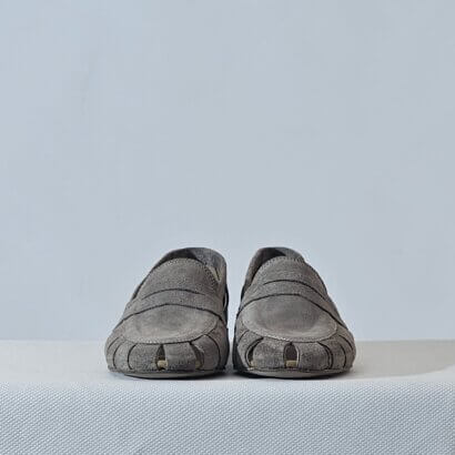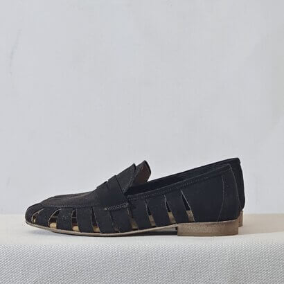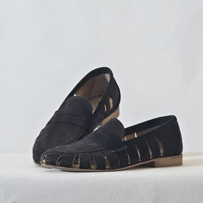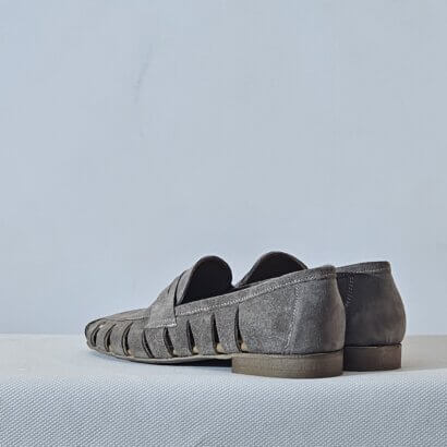 The Antica Bottega loafers for women, made from perforated suede. Available in both taupe and brown, they were designed & produced in Italy to ensure comfort and style.