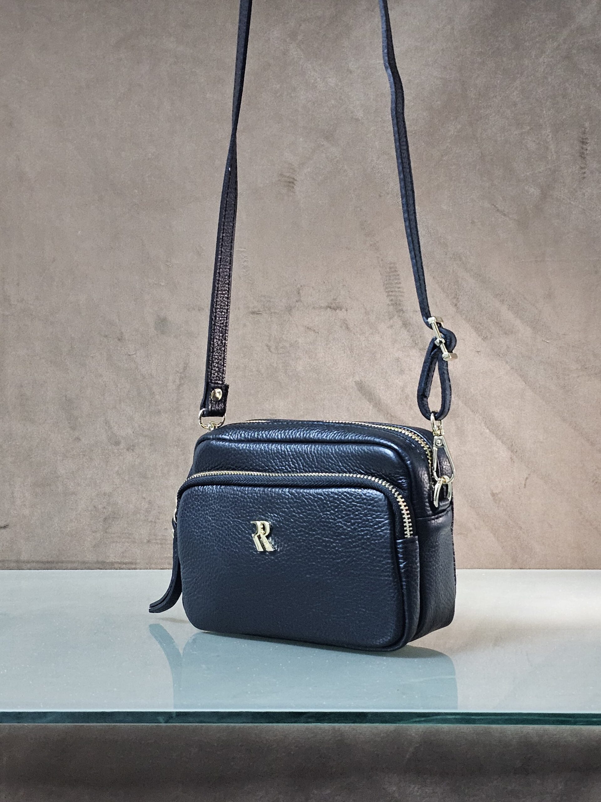 Stylish Calf Leather Crossbody Bag. External zip pocket. Adjustable strap. Compact size. Dust bag included. Bruno Rossi.